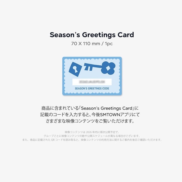 2. 商品に含まれている「Season's Greetings Card」に記載のコードを入力すると、今後SMTOWNアプリにてさまざまな映像コンテンツをご覧いただけます。 映像コンテンツは2026年1月から2026年12月にかけて順次公開予定で、グループごとに映像コンテンツの数や公開スケジュールが異なる場合がございます。 また、商品に記載されたQRコードを読み取ると、映像コンテンツの利用方法に関するご案内を後日ご確認いただけます。